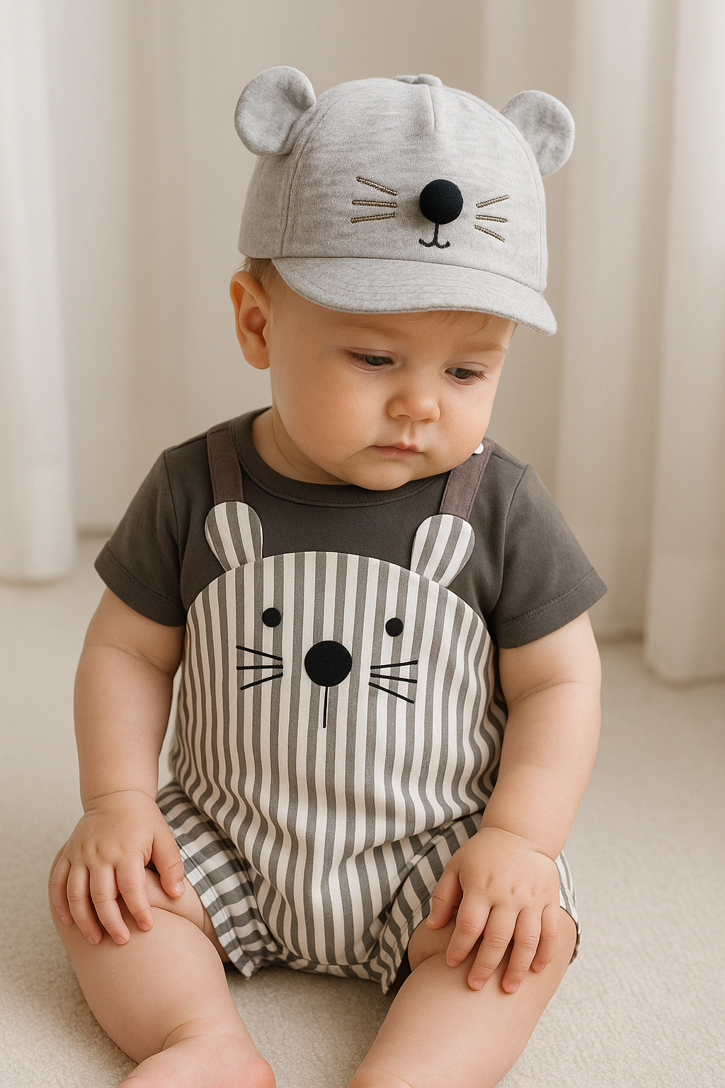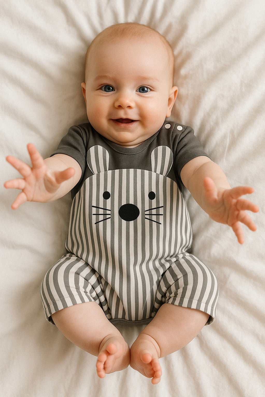 Romper de manga corta con short, confeccionado en una mezcla suave de 90% algodón y 10% poliéster, ideal para mantener a tu bebé fresco y cómodo durante todo el día..